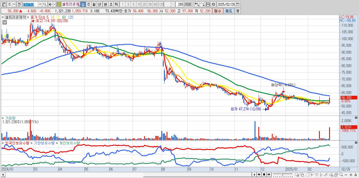 - 셀트리온제약 (56,300원 ▲ 8.9% , 시총: 23,423억, 외국인 순매수 거래금:35억)