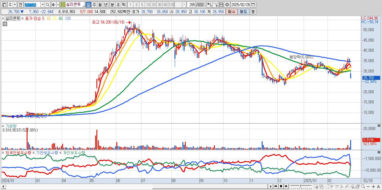 - 실리콘투 (26,700원 ▼ -22.94% , 시총: 16,333억, 거래량: 8,918,953, 거래대금:2,526억)