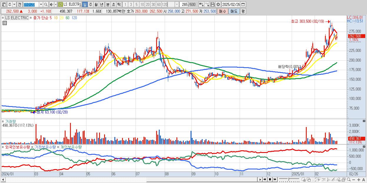 - LS ELECTRIC (262,500원 ▲ 1.16% , 시총: 78,750억, 거래량: 498,367, 거래대금:1,309억)
