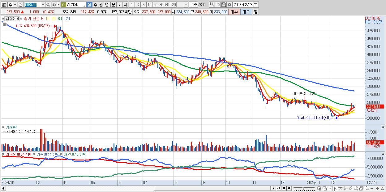 - 삼성SDI (237,500원 ▲ 0.42% , 시총: 163,316억, 거래량: 667,849, 거래대금:1,580억)