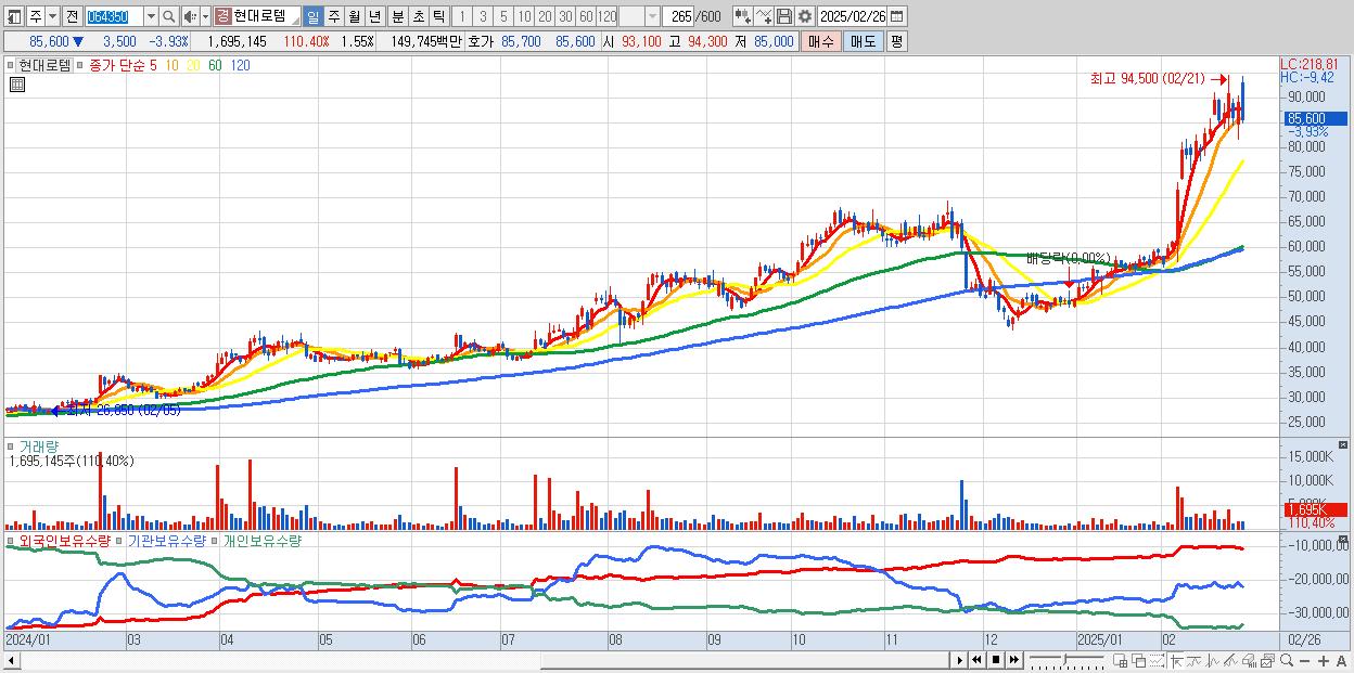 - 현대로템 (85,600원 ▼ -3.93% , 시총: 93,426억, 거래량: 1,695,145, 거래대금:1,497억)