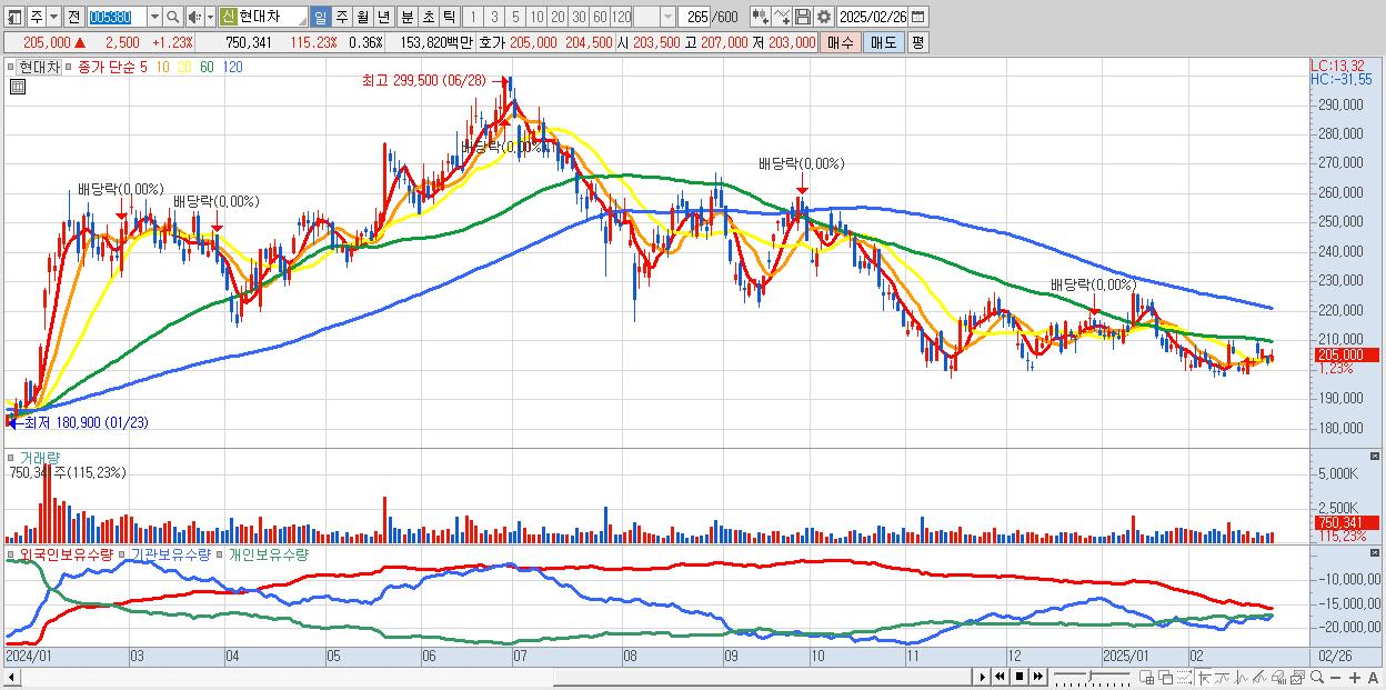 - 현대차 (205,000원 ▲ 1.23% , 시총: 429,303억, 거래량: 750,341, 거래대금:1,538억)