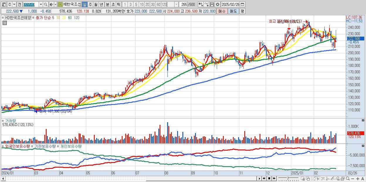 - HD한국조선해양 (222,500원 ▼ -0.45% , 시총: 157,470억, 거래량: 578,436, 거래대금:1,314억)
