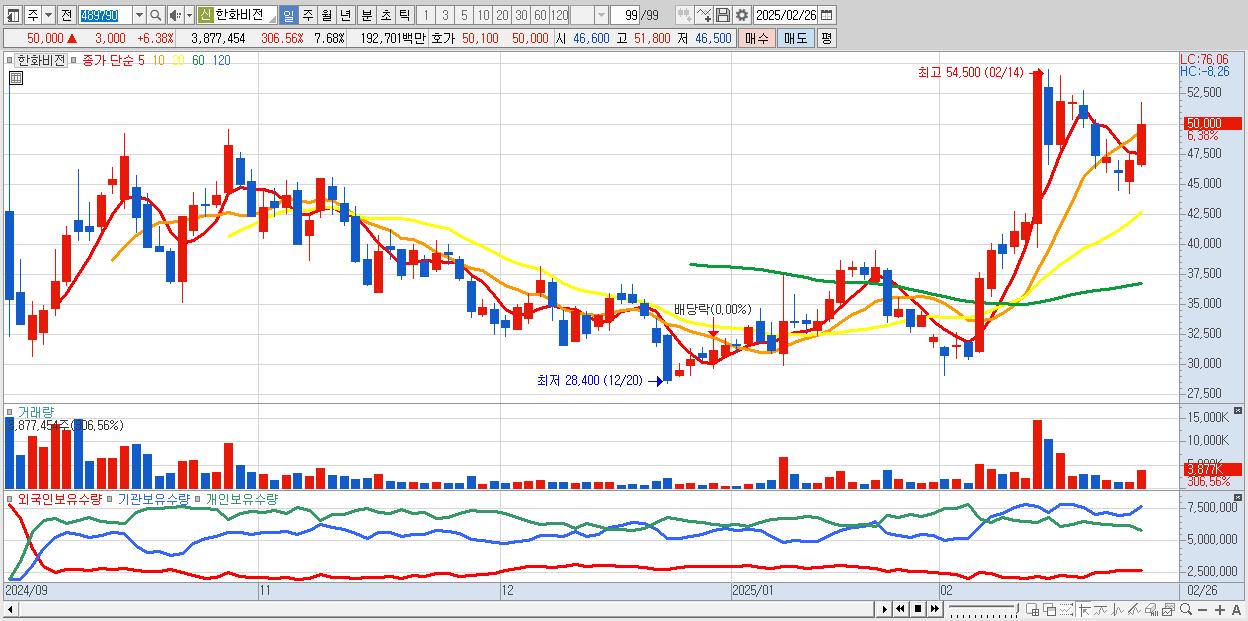 - 한화비전 (50,000원 ▲ 6.38% , 시총: 25,244억, 거래량: 3,877,454, 거래대금:1,927억)