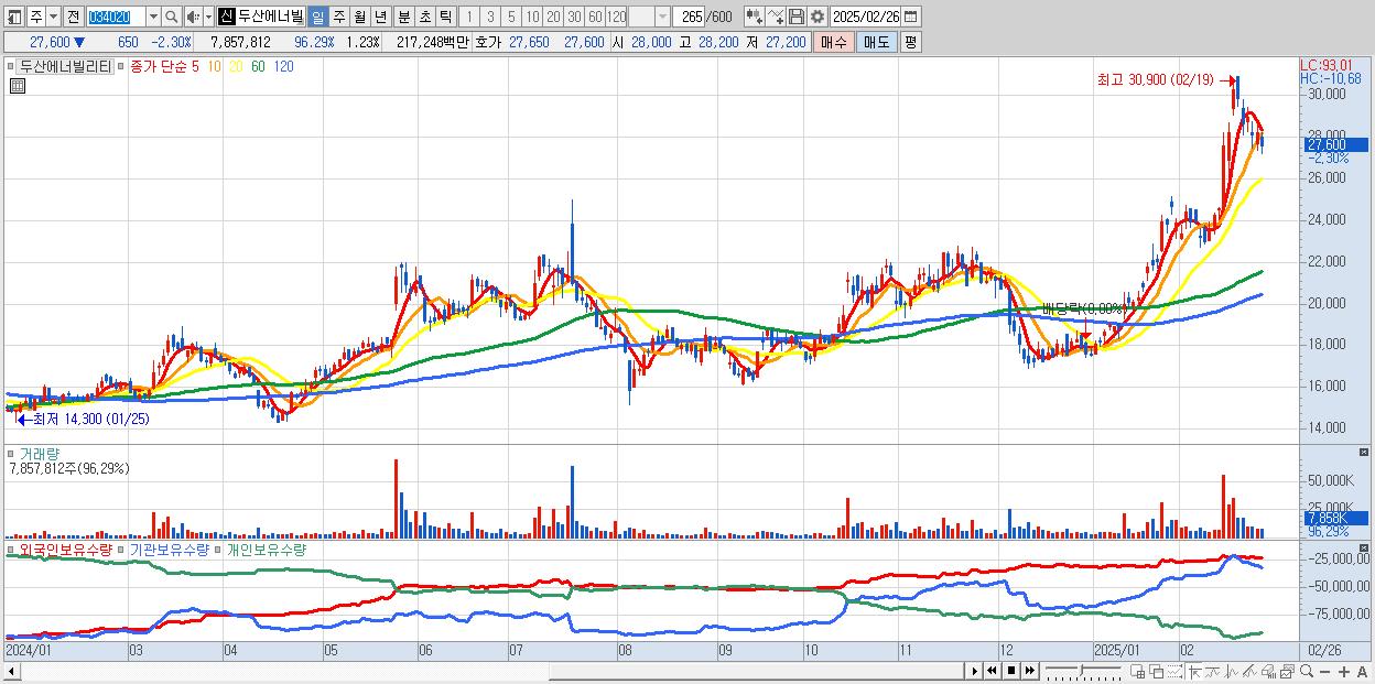 - 두산에너빌리티 (27,600원 ▼ -2.3% , 시총: 176,795억, 거래량: 7,857,812, 거래대금:2,172억)
