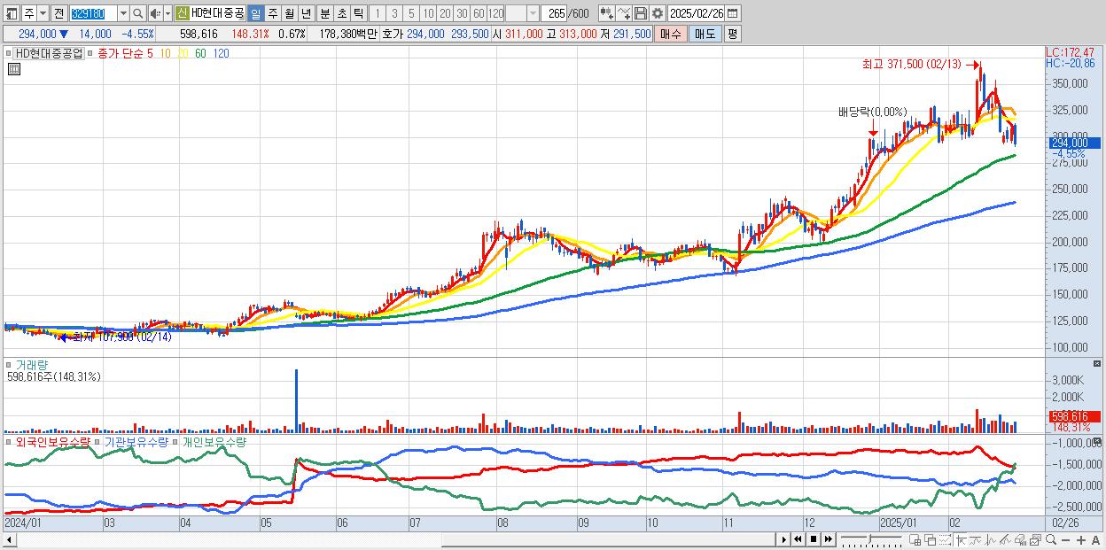 - HD현대중공업 (294,000원 ▼ -4.55% , 시총: 260,993억, 거래량: 598,616, 거래대금:1,784억)