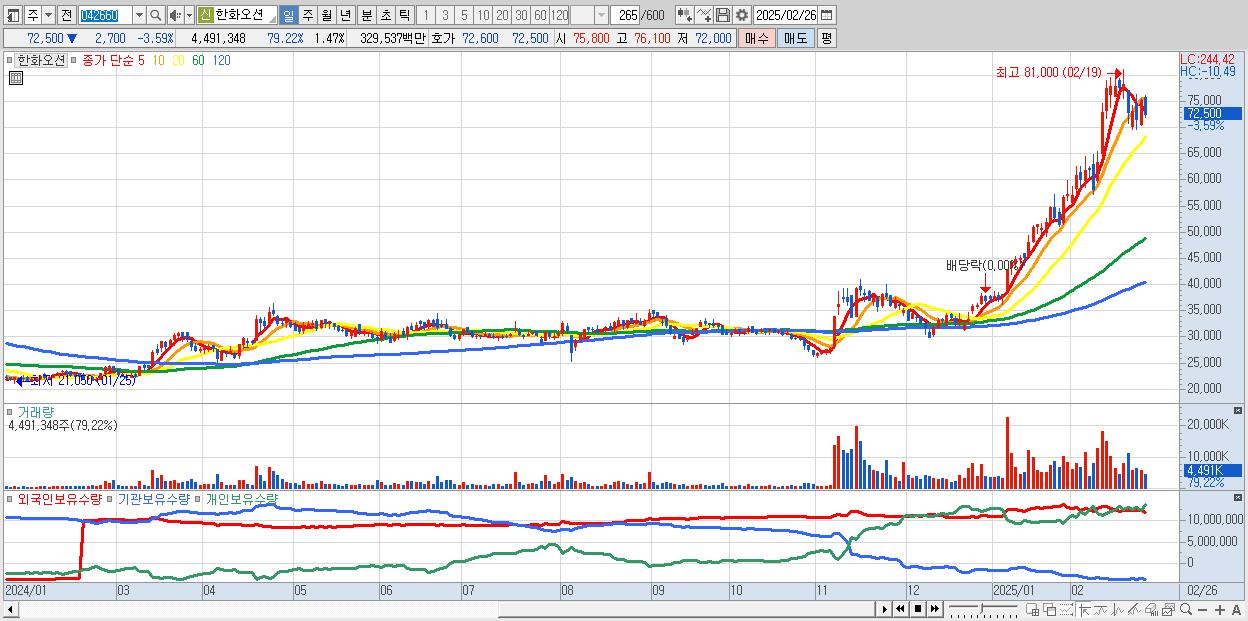- 한화오션 (72,500원 ▼ -3.59% , 시총: 222,150억, 거래량: 4,491,348, 거래대금:3,295억)