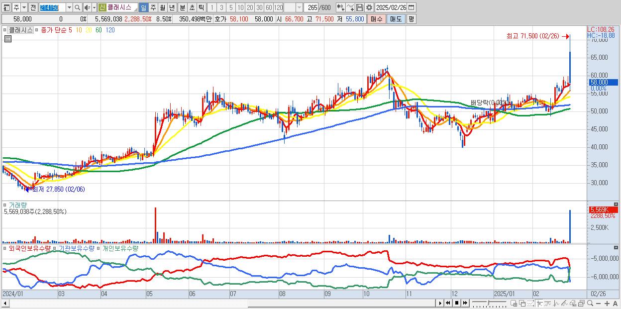 - 클래시스 (58,000원 0% , 시총: 37,993억, 거래량: 5,569,038, 거래대금:3,505억)