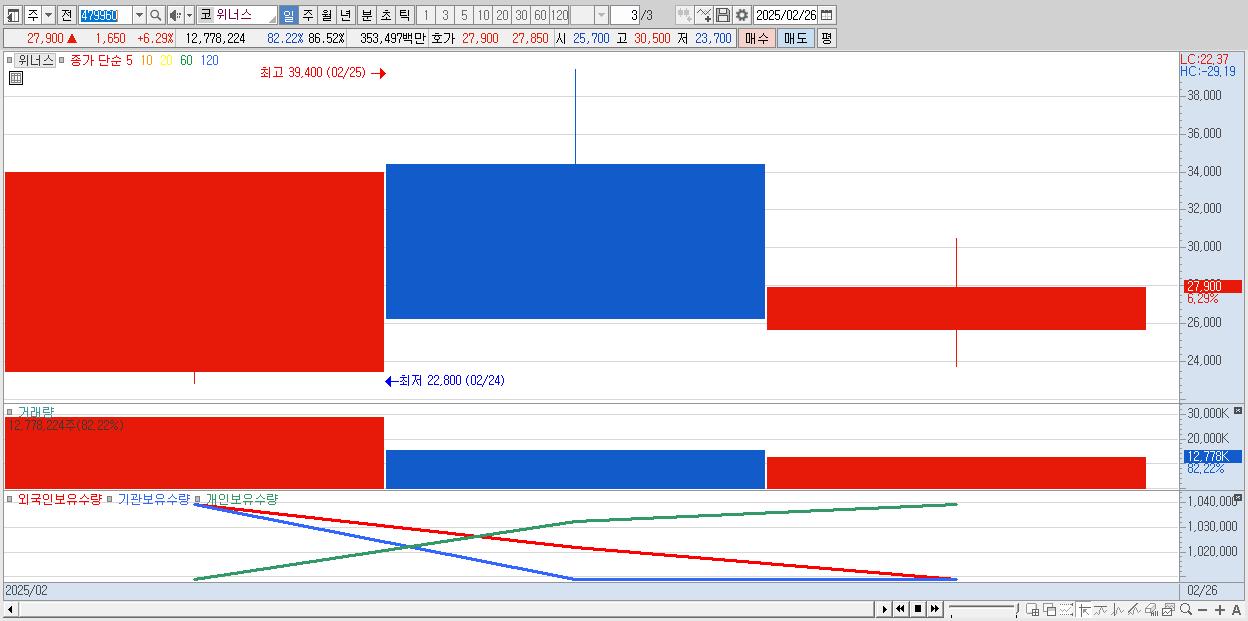 - 위너스 (27,900원 ▲ 6.29% , 시총: 1,911억, 거래량: 12,778,224, 거래대금:3,535억)