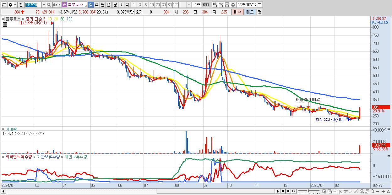 - 플루토스 (304원 ▲ 29.91% , 시총: 199억, 거래량: 13,674,452, 거래대금:39억)