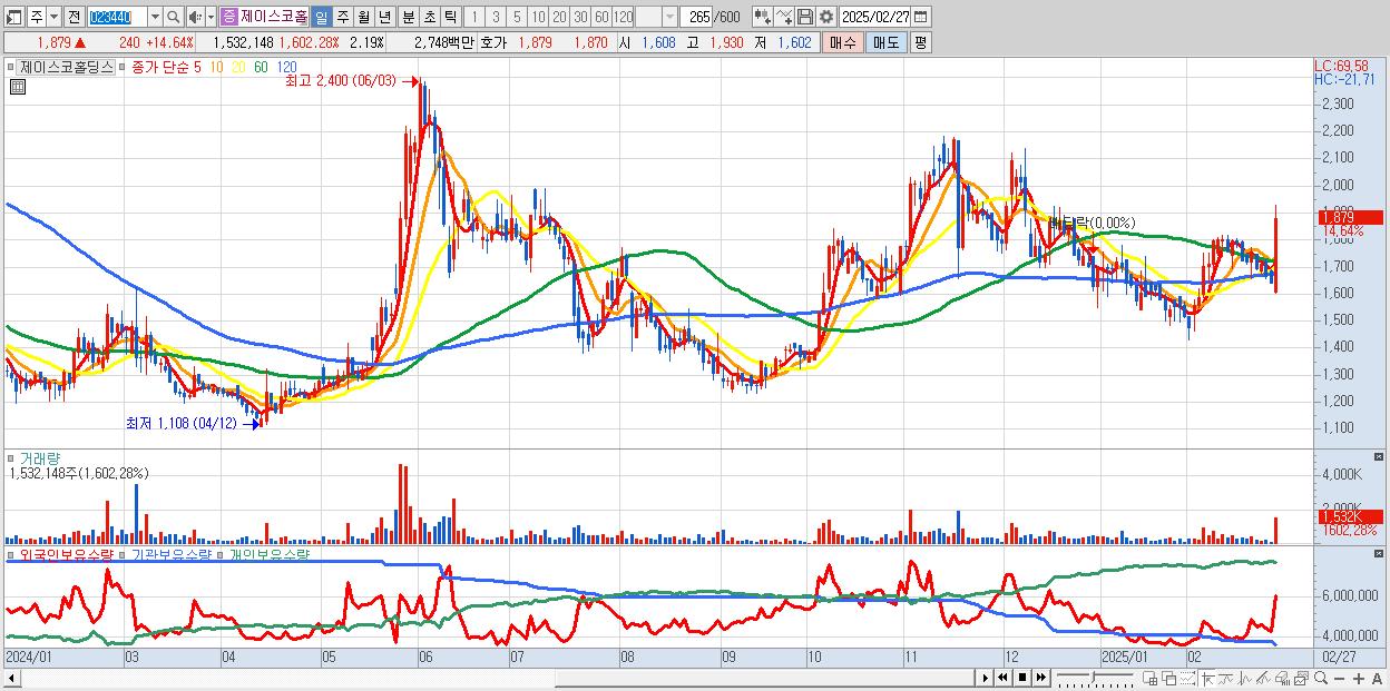 - 제이스코홀딩스 (1,879원 ▲ 14.64% , 시총: 1,315억, 거래량: 1,532,148, 거래대금:27억)