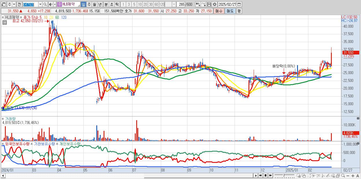 - HLB제약 (31,550원 ▲ 17.29% , 시총: 10,038억, 거래량: 4,819,503, 거래대금:1,516억)