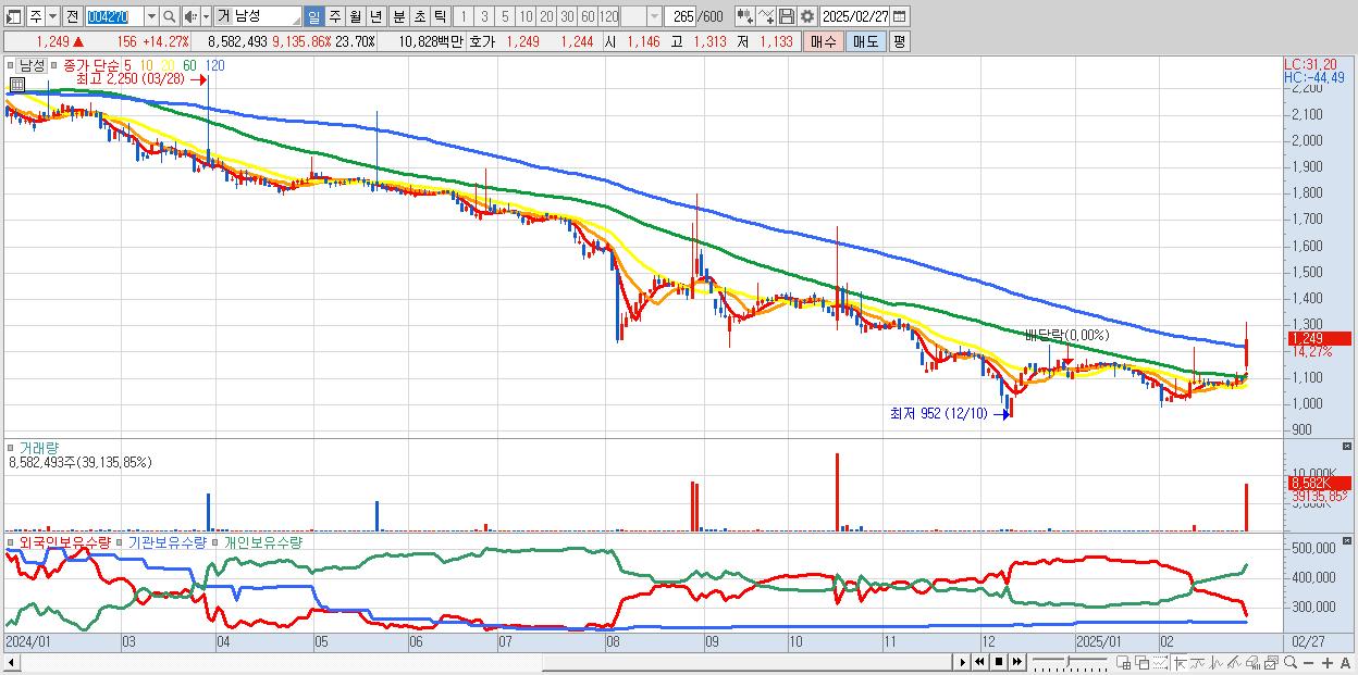 - 남성 (1,249원 ▲ 14.27% , 시총: 452억, 거래량: 8,582,493, 거래대금:108억)