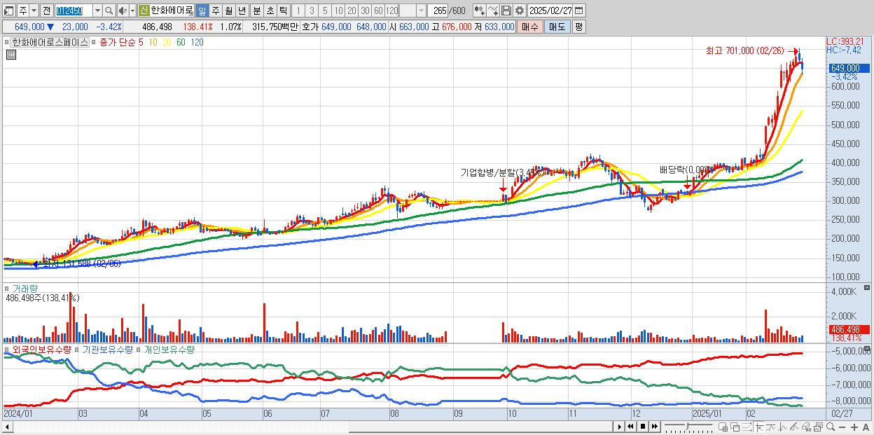 - 한화에어로스페이스 (649,000원 ▼ -3.42% , 시총: 295,822억, 외국인 순매수 거래금:135억)