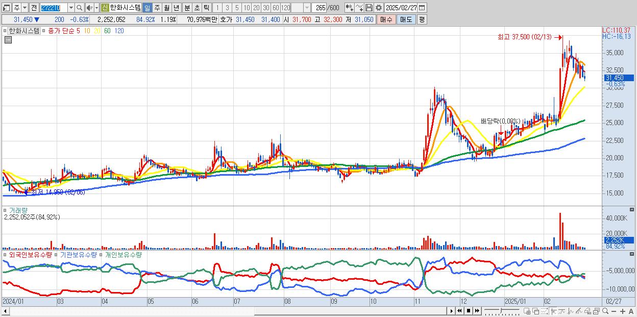 - 한화시스템 (31,450원 ▼ -0.63% , 시총: 59,415억, 외국인 순매수 거래금:54억)