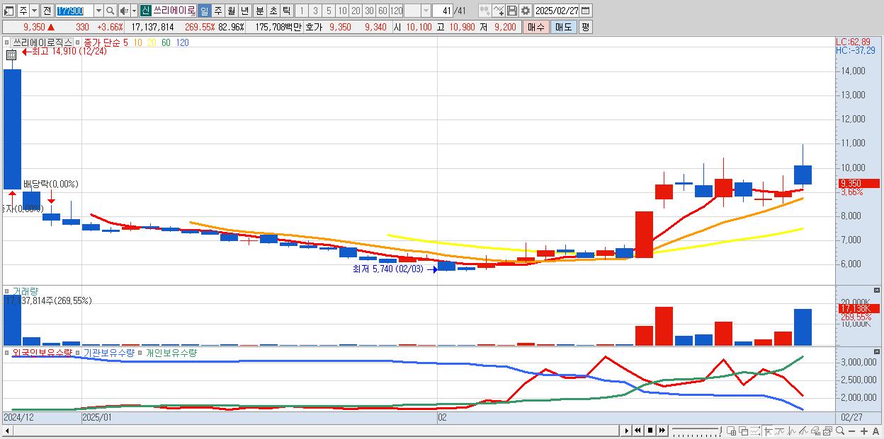 - 쓰리에이로직스 (9,350원 ▲ 3.66% , 시총: 876억, 거래량: 17,137,814, 거래대금:1,757억)