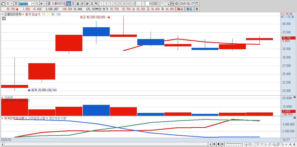 - 오름테라퓨틱 (35,750원 ▲ 5.46% , 시총: 7,482억, 거래량: 3,545,087, 거래대금:1,251억)
