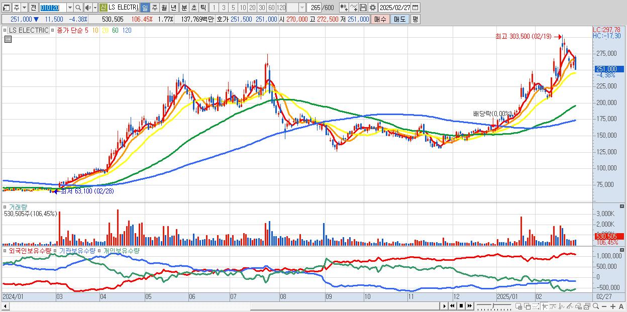 - LS ELECTRIC (251,000원 ▼ -4.38% , 시총: 75,300억, 거래량: 530,505, 거래대금:1,378억)