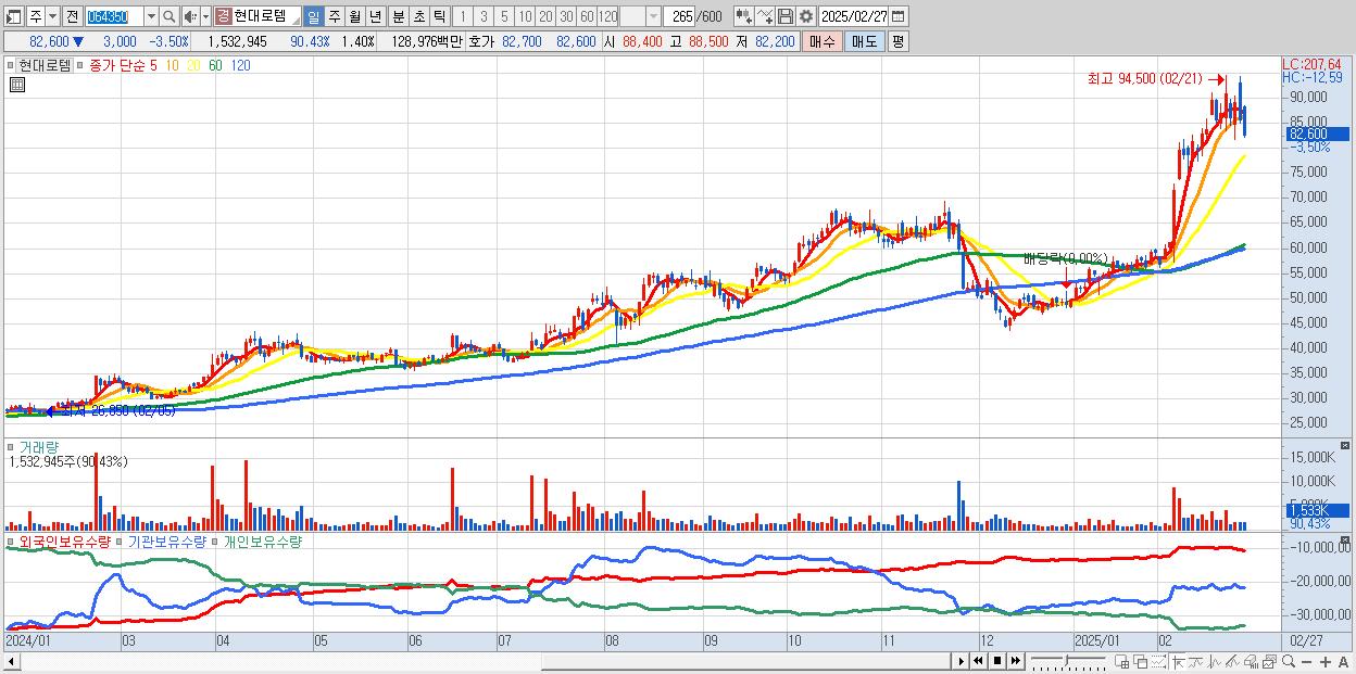 - 현대로템 (82,600원 ▼ -3.5% , 시총: 90,152억, 거래량: 1,532,945, 거래대금:1,290억)