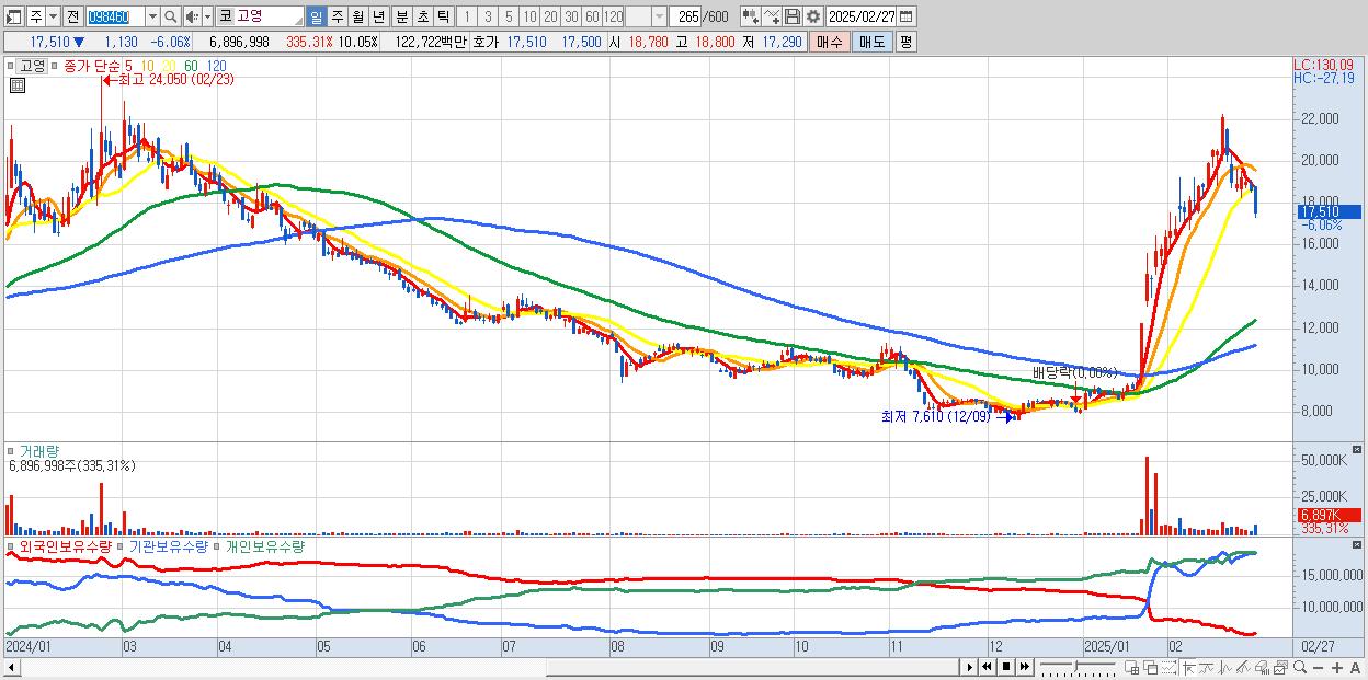 - 고영 (17,510원 ▼ -6.06% , 시총: 12,021억, 거래량: 6,896,998, 거래대금:1,227억)