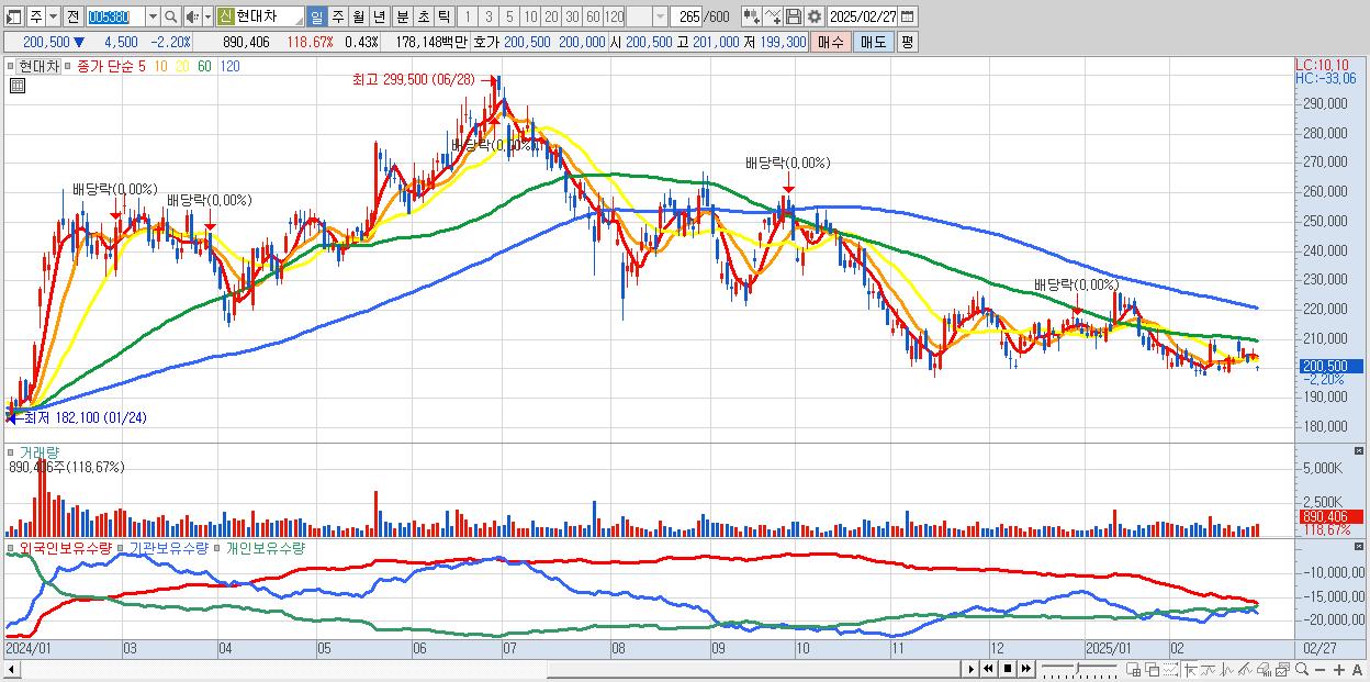 - 현대차 (200,500원 ▼ -2.2% , 시총: 419,879억, 거래량: 890,406, 거래대금:1,781억)