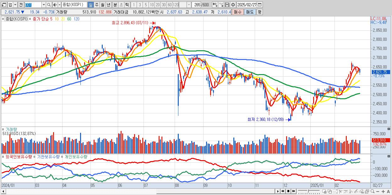 | 02/27 | 2,621.75 | ▼-0.73% | 4,810억 | -1,754억 | -3,389억 | 333억 |