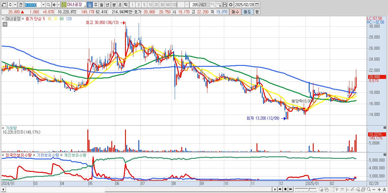 - 마녀공장 (20,800원 ▲ 8.67% , 시총: 3,407억, 거래량: 10,220,872, 거래대금:2,149억)