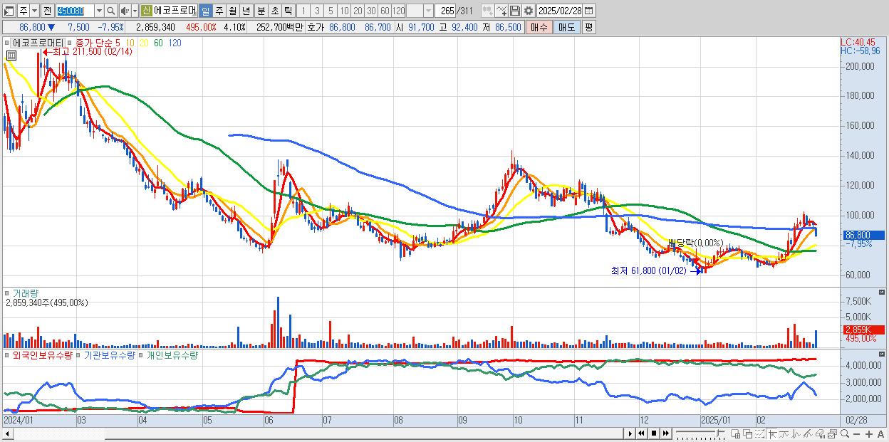 - 에코프로머티 (86,800원 ▼ -7.95% , 시총: 60,533억, 외국인 순매수 거래금:76억)