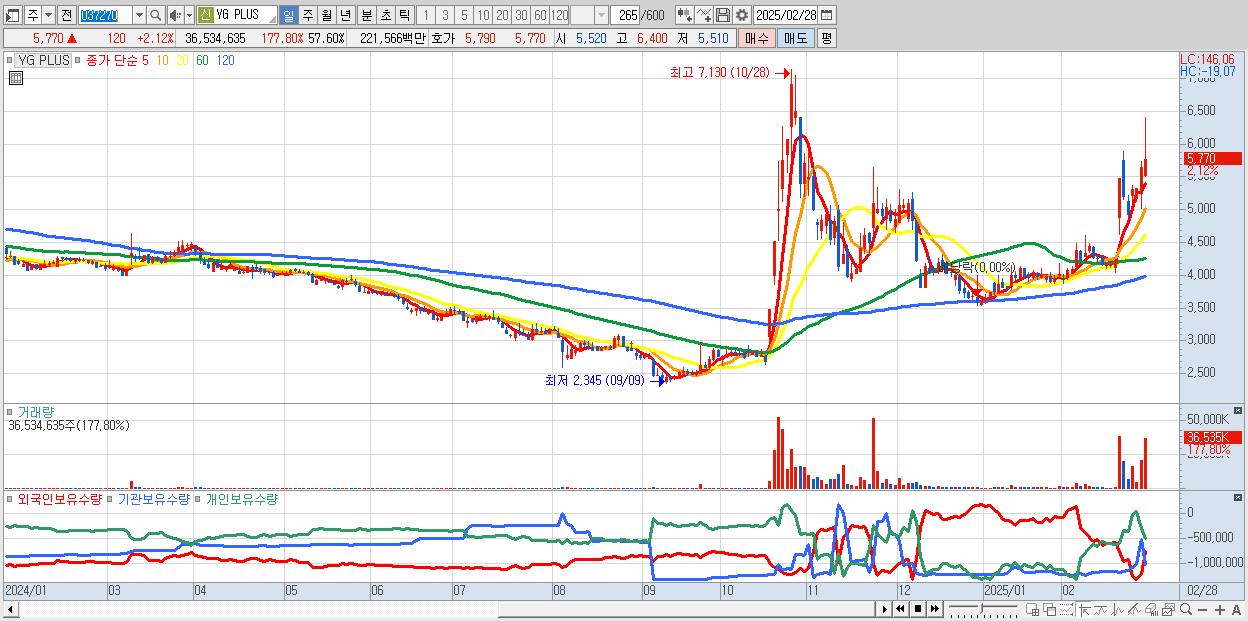- YG PLUS (5,770원 ▲ 2.12% , 시총: 3,660억, 외국인 순매수 거래금:27억)