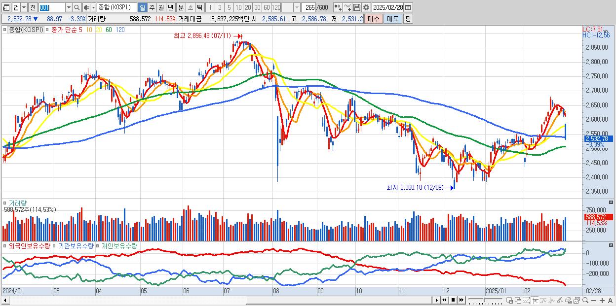 | 02/17 | 2,610.42 | ▲0.75% | -336억 | -2,228억 | 2,431억 | 133억 |