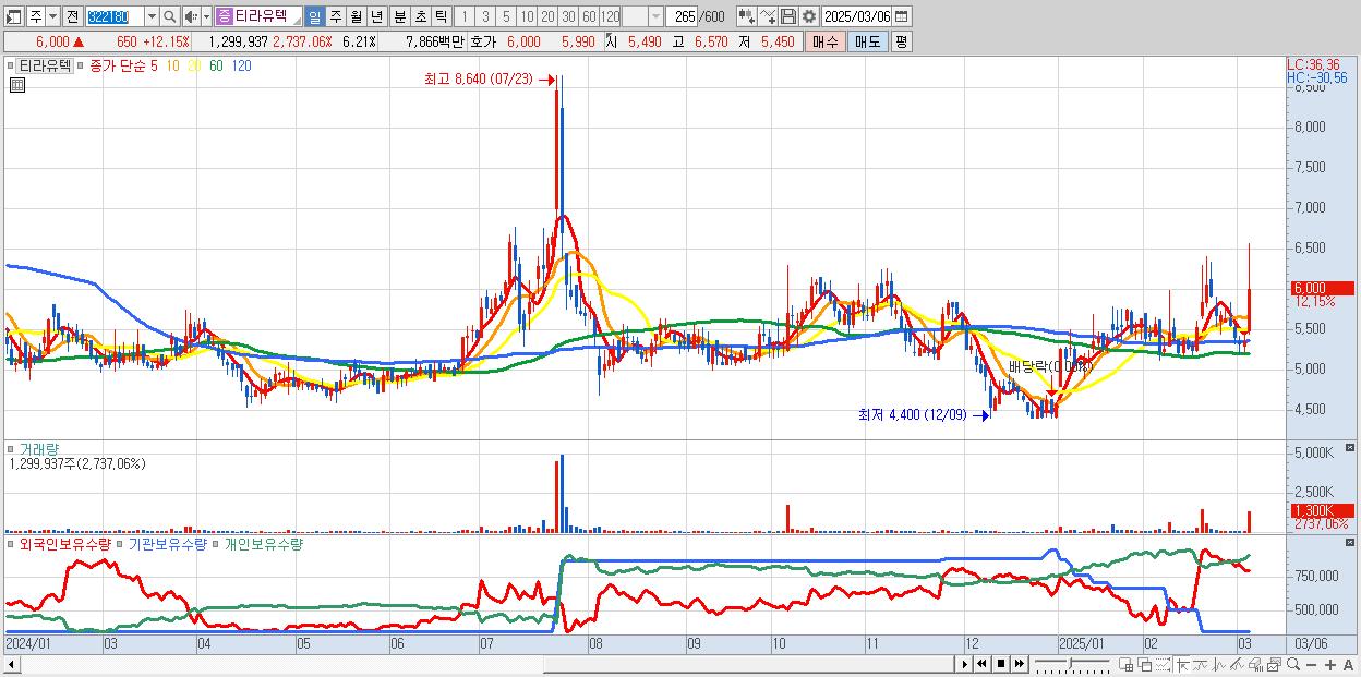 - 티라유텍 (6,000원 ▲ 12.15% , 시총: 1,255억, 거래량: 1,299,937, 거래대금:79억)