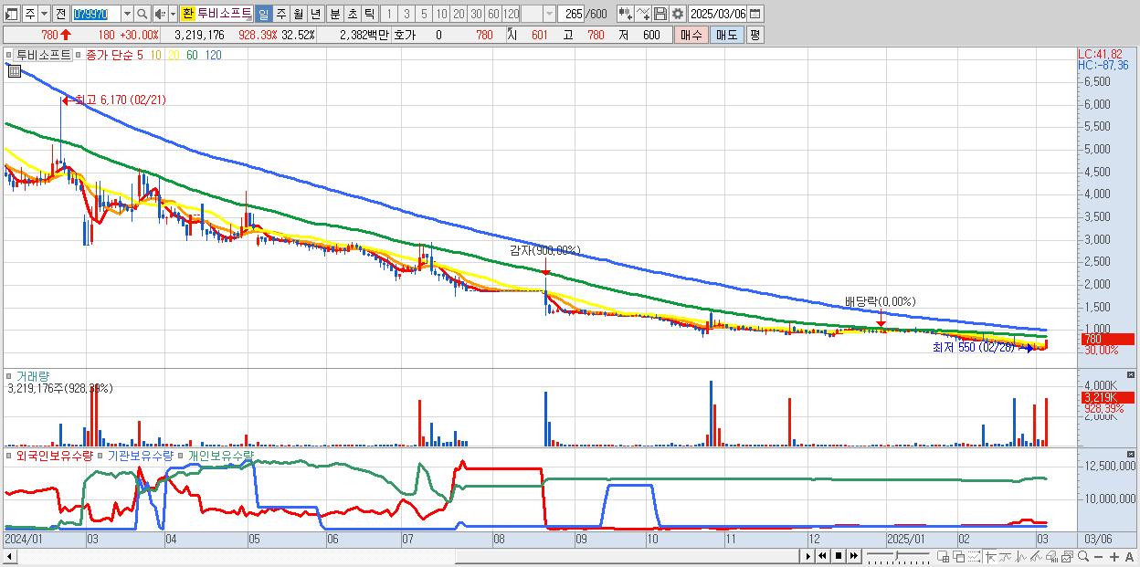 - 투비소프트 (780원 ▲ 30% , 시총: 77억, 거래량: 3,219,176, 거래대금:24억)