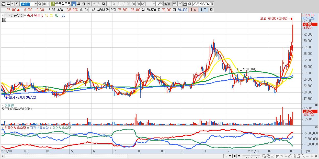 - 한국항공우주 (76,400원 ▲ 9.93% , 시총: 74,471억, 거래량: 5,971,628, 거래대금:4,514억)