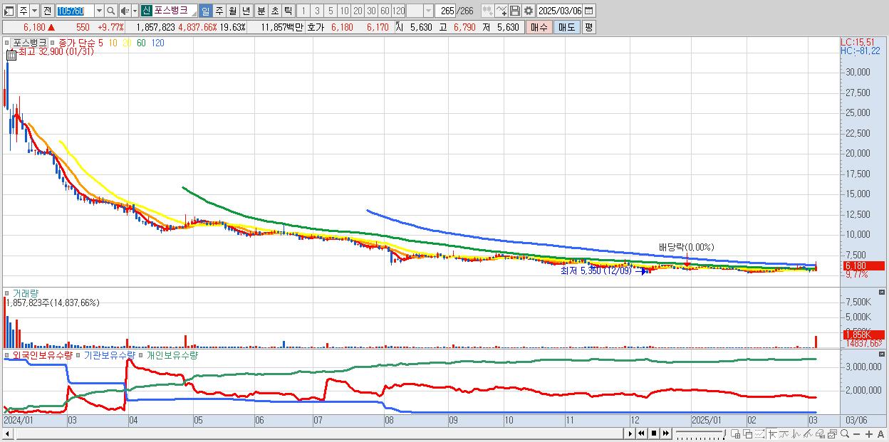 - 포스뱅크 (6,180원 ▲ 9.77% , 시총: 585억, 거래량: 1,857,823, 거래대금:119억)
