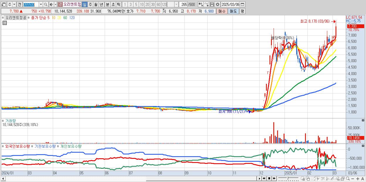 - 오리엔트정공 (7,700원 ▲ 10.79% , 시총: 2,444억, 거래량: 10,144,528, 거래대금:760억)