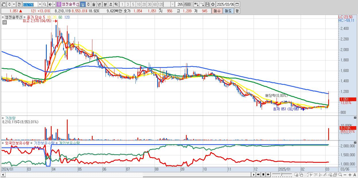 - 엠젠솔루션 (1,051원 ▲ 13.01% , 시총: 456억, 거래량: 8,210,119, 거래대금:96억)