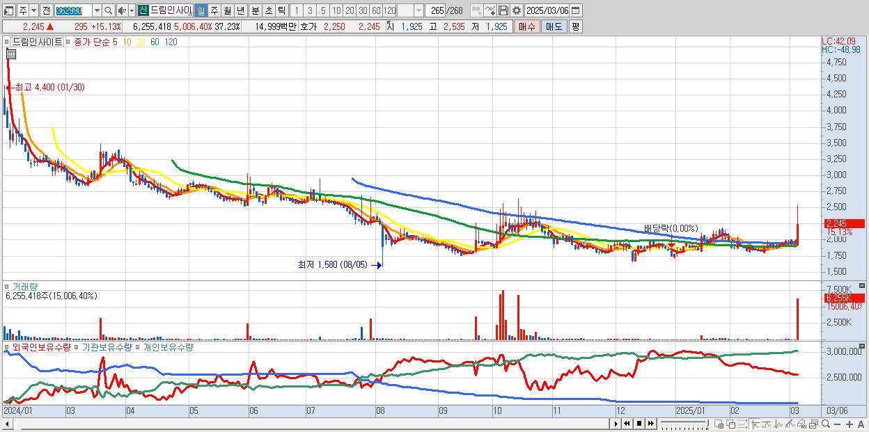 - 드림인사이트 (2,245원 ▲ 15.13% , 시총: 377억, 거래량: 6,255,418, 거래대금:150억)