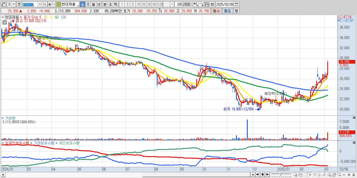 - 현대제철 (29,300원 ▲ 9.94% , 시총: 39,100억, 거래량: 3,113,389, 거래대금:893억)