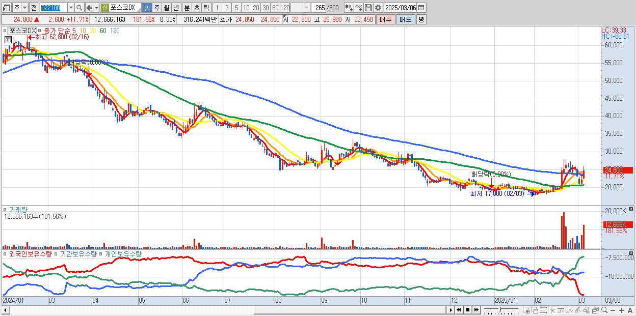 - 포스코DX (24,800원 ▲ 11.71% , 시총: 37,705억, 거래량: 12,666,163, 거래대금:3,162억)