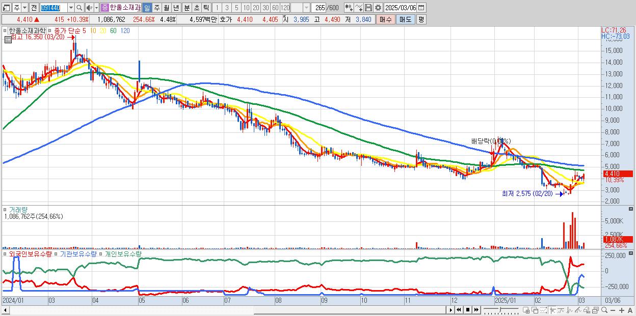 - 한울소재과학 (4,410원 ▲ 10.39% , 시총: 1,069억, 거래량: 1,086,762, 거래대금:46억)