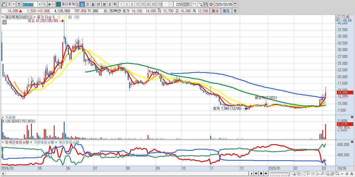 - 제이투케이바이오 (14,090원 ▲ 12.09% , 시총: 808억, 거래량: 4,126,569, 거래대금:614억)