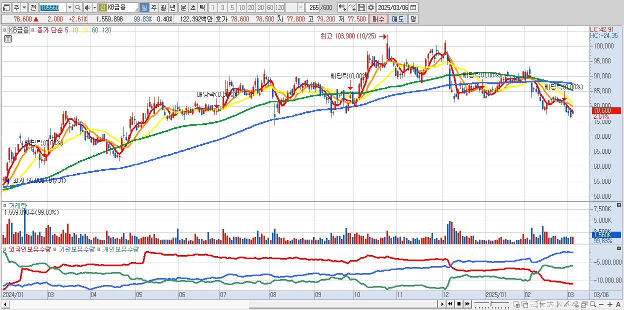 - KB금융 (78,600원 ▲ 2.61% , 시총: 309,313억, 외국인 순매수 거래금:94억)