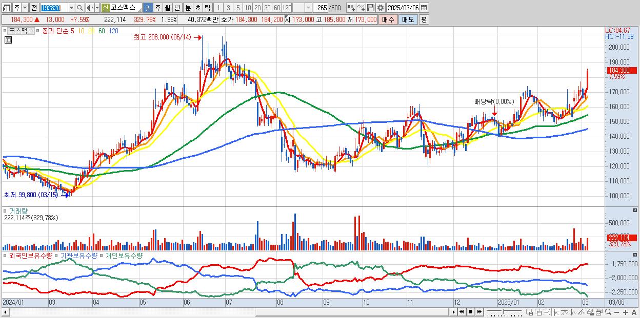 - 코스맥스 (184,300원 ▲ 7.59% , 시총: 20,917억, 외국인 순매수 거래금:166억)