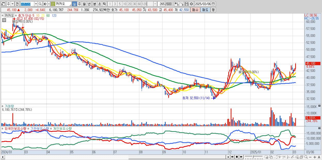 2.카카오 45,100원 ▲ 4.64% (KOSPI, 035720)