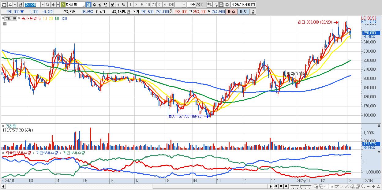 - 하이브 (250,000원 ▼ -0.4% , 시총: 104,130억, 외국인 순매수 거래금:57억)