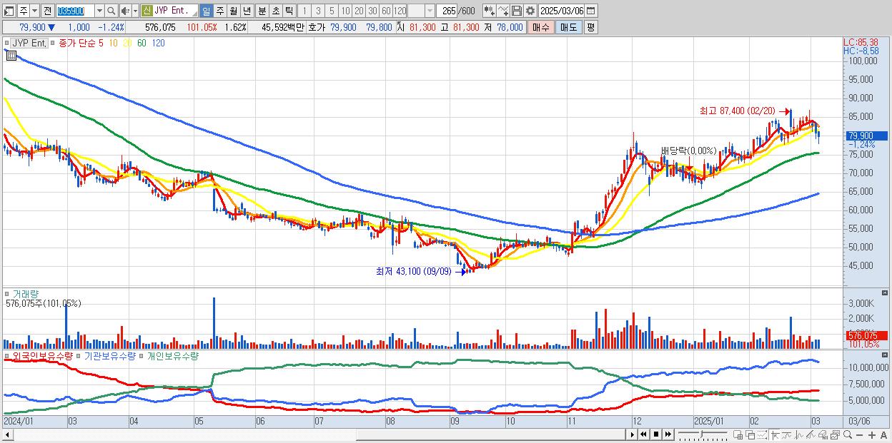 - JYP Ent. (79,900원 ▼ -1.24% , 시총: 28,390억, 외국인 순매수 거래금:78억)
