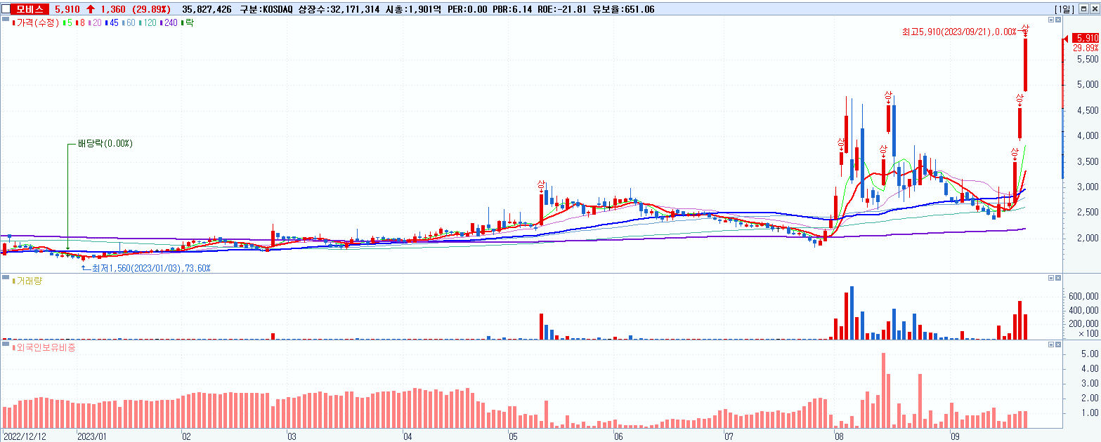 - 모비스 (5,910원 ▲ 29.89% , 시총: 1,901억, 거래량: 35,827,426, 거래대금:1,986억)