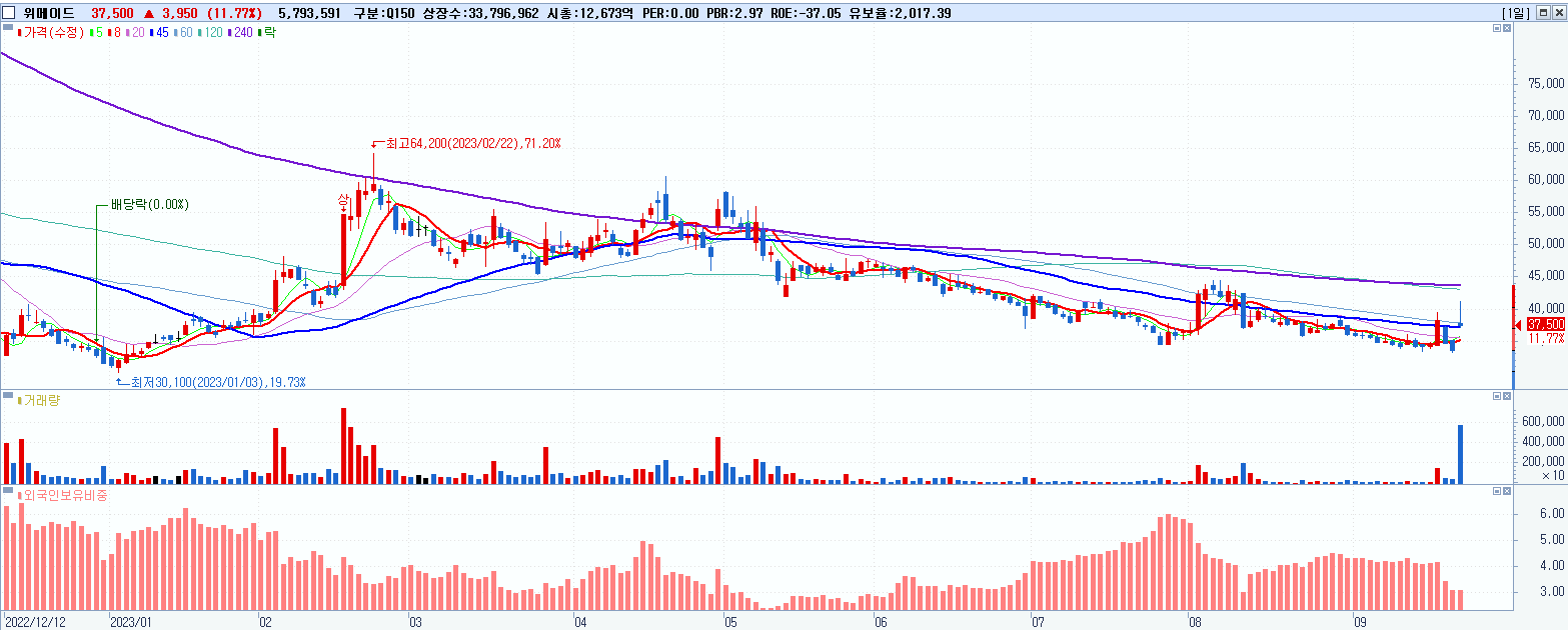 - 위메이드 (37,500원 ▲ 11.77% , 시총: 12,674억, 거래량: 5,793,591, 거래대금:2,302억)