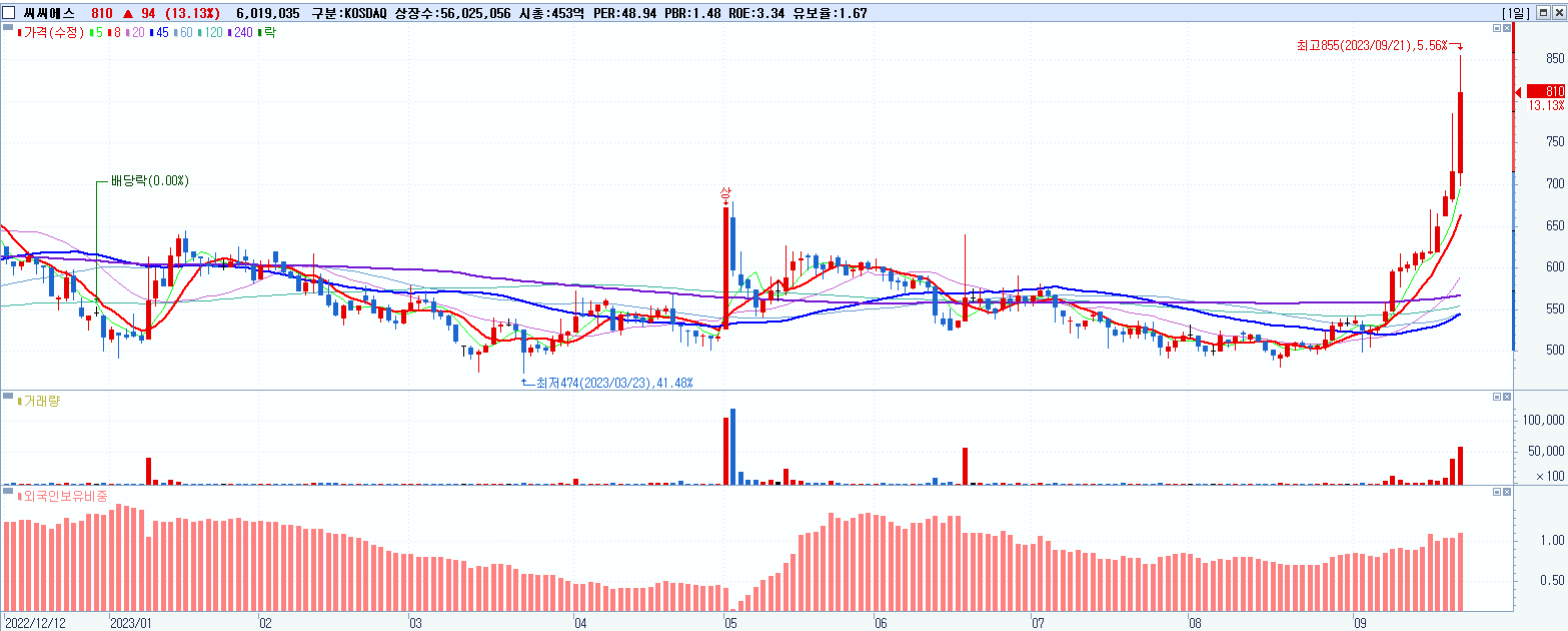 - 씨씨에스 (810원 ▲ 13.13% , 시총: 454억, 거래량: 6,019,035, 거래대금:48억)
