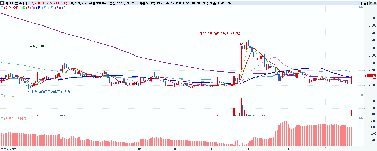 - 에이디엠코리아 (2,250원 ▲ 10.02% , 시총: 491억, 거래량: 8,419,712, 거래대금:195억)